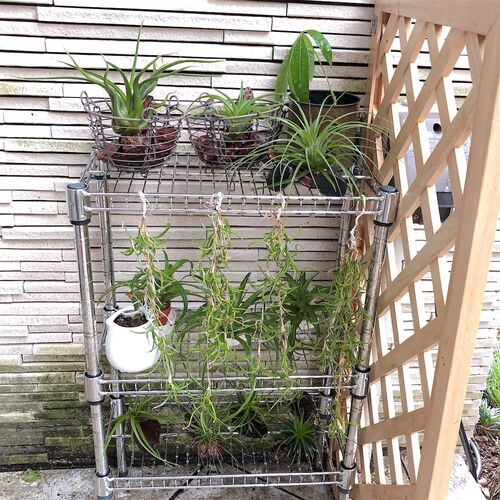 我が家の外についにできたエアプランツ棚。 お世話の「ちょうどいい塩梅」探しに試行錯誤中です。 前にもお話ししましたが、これからの西日をどうやってちょうどいい日差しにするかが今の課題です。 棚の環境は、南に塀、東には少し離れて塀、西に大きな木が…